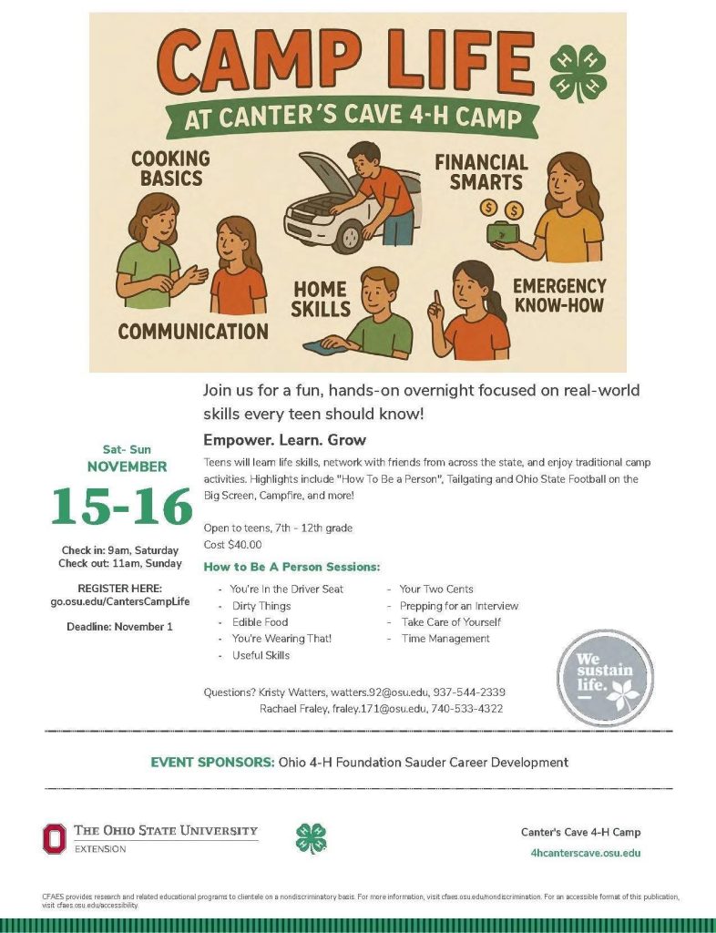 Join in November 15th-16th at Canter’s Cave 4-H Camp. Youth will learn skills you’ll actually use – like sewing on a button, preparing a meal, and basic car care – then kick back and relax with Ohio State Buckeyes tailgate, dance, and campfire. A weekend of life skills + camp vibes = memories made. The camp is open to teens in grades 7-12.