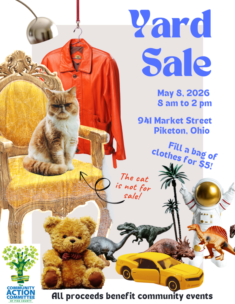 The Community Action Committee of Pike County (CAC) is hosting a Yard Sale fundraiser on Friday, May 8, 2026. The event will take place from 8 am to 2 pm at the agency office located at 941 Market Street in Piketon. Area residents are encouraged to visit and explore a vast selection of items, including a special promotion where shoppers can fill a bag with clothing for $5.