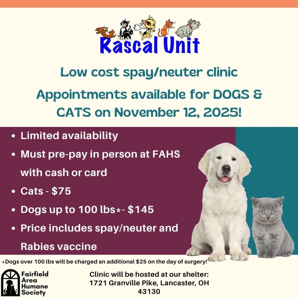 (Lancaster) – The Fairfield Area Humane Society is now booking appointments for dogs and cats with the Rascal Unit for November 12th. Appointments are in high demand.