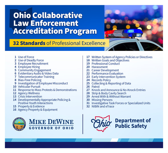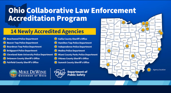 (COLUMBUS, Ohio) – Ohio Governor Mike DeWine announced the latest Ohio law enforcement agencies to achieve accreditation through the new Ohio Collaborative Law Enforcement Accreditation Program.