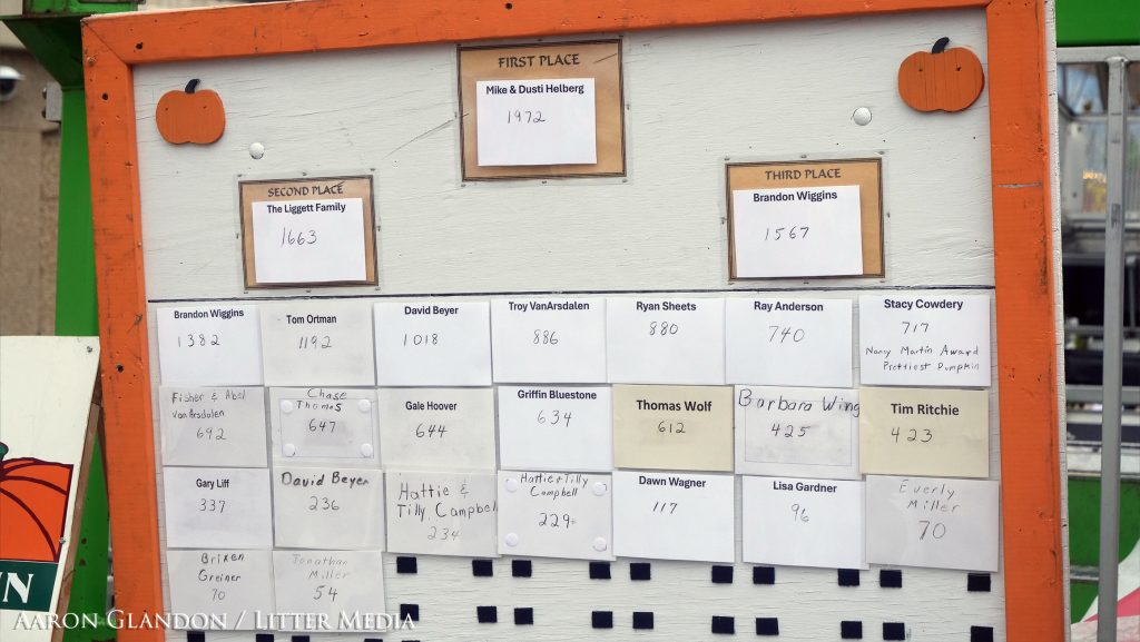 Last year’s winners, Bob & Jo Liggett, were this year’s runners-up with a 1,663 pound pumpkin. Third place went to Brandon Wiggins, with a weigh-in of 1,567 pounds.