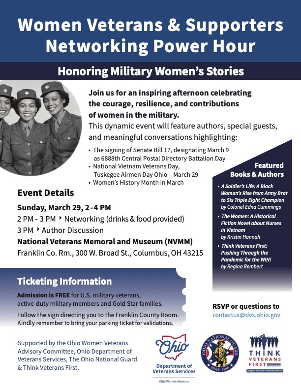 The event serves as an Ohio Women Veterans Advisory Committee “Power Hour” and also is supported by ODVS, the National Veterans Memorial and Museum, the Ohio National Guard, and Think Veterans First.