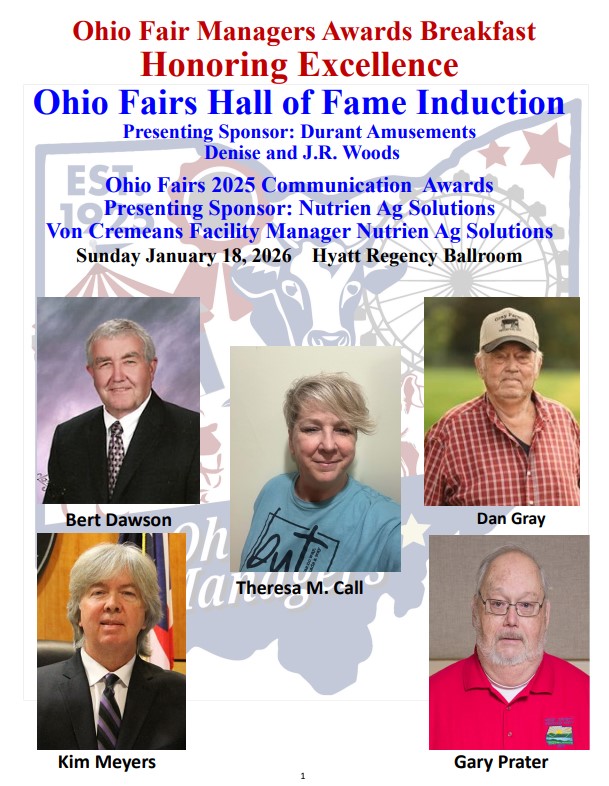 During Prater’s 40 years of service, he served as Chairman of the Grandstand Entertainment Committee and has been a steadfast supporter of the Junior Livestock Sale. He also worked with the OFMA as District 4 Director from 2003 through 2013 and again in 2019. Joining Prater in the Hall this year, Lorain County Fair’s Kim Meyers, Columbiana County Fair’s Bert Dawson, Summit County Fair’s Theresa Call and Brown County Fair’s Dan Gray.
