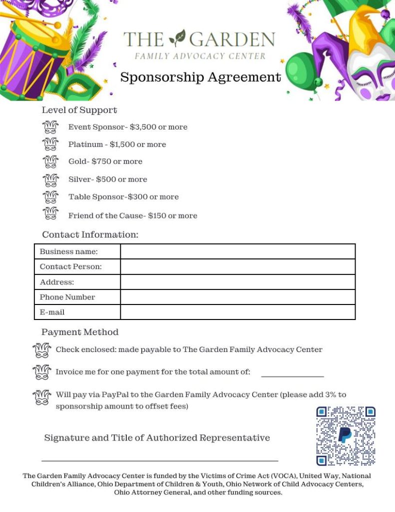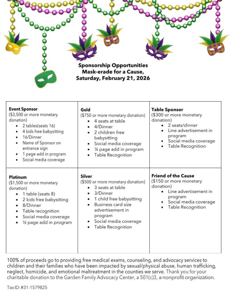 Sponsorship opportunities are now open and this is your chance to support the Garden Family Advocacy Center and their mission to provide free abuse assessments for children and their families that have been affected by the trauma of child sexual/physical abuse, neglect, witness to homicide, and human trafficking.