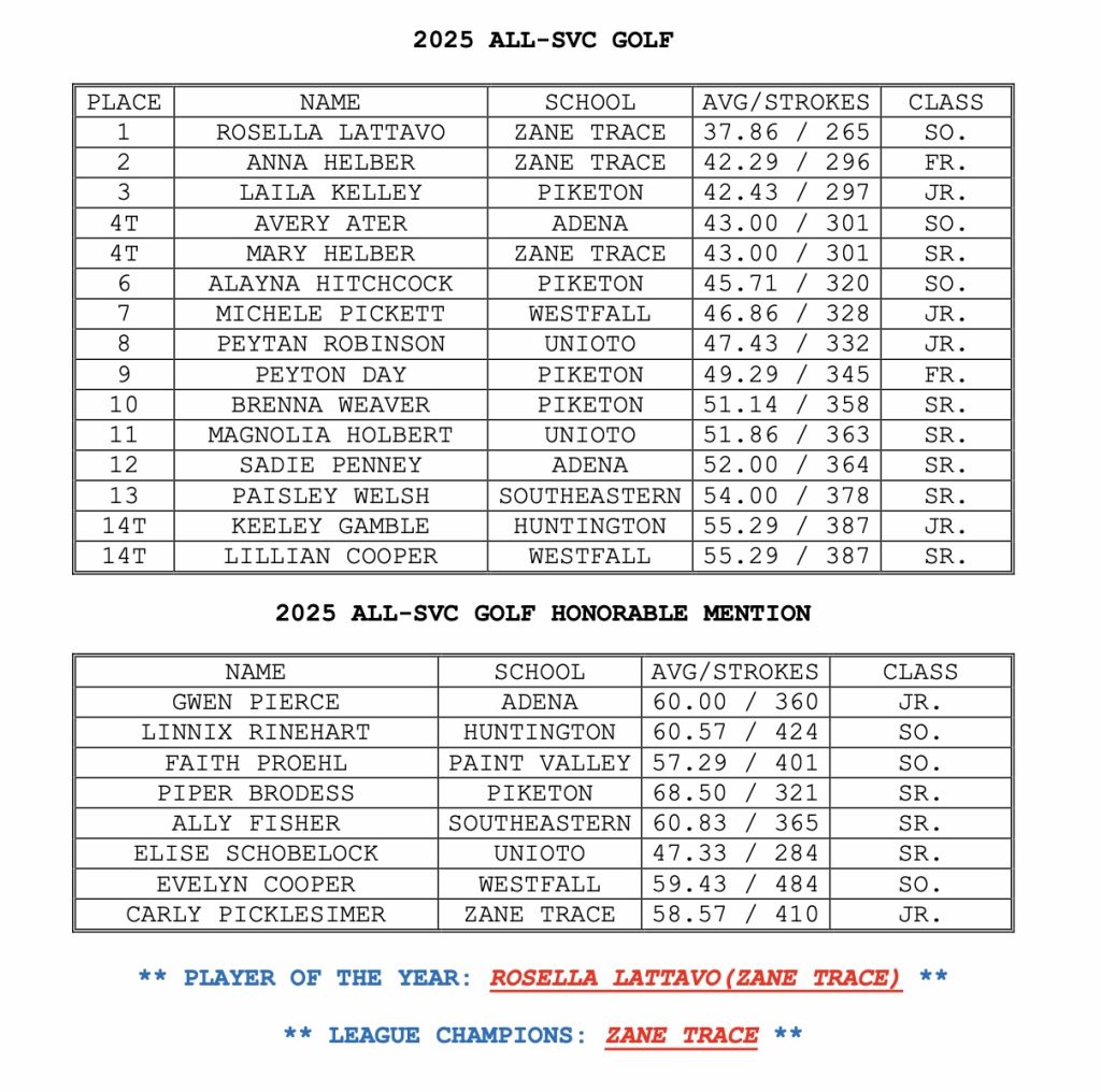 Rosella Lattavo of Zane Trace is the SVC Girls “Golfer of the Year“. The ZT sophomore was one of three Lady Pioneers to earn All Conference, based on their best average scores. Zane Trace is the 2025 SVC Champion.